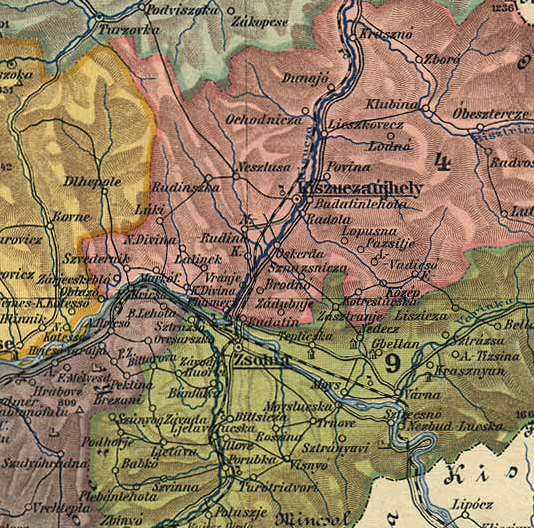 Druhá mapa je z obdobia krátko po vzniku ČSR, avšak samotné názvy sú ešte v Maďarčine a Nemčine.