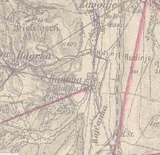 Celkom dobre na nej vidíme starú hlavnú cestu, ktorá prechádza Rajčankou a smeruje smerom na Žilinu. Taktiež vidíme historické názvy Hlín a Rudín ako HLINI a Rudinji.